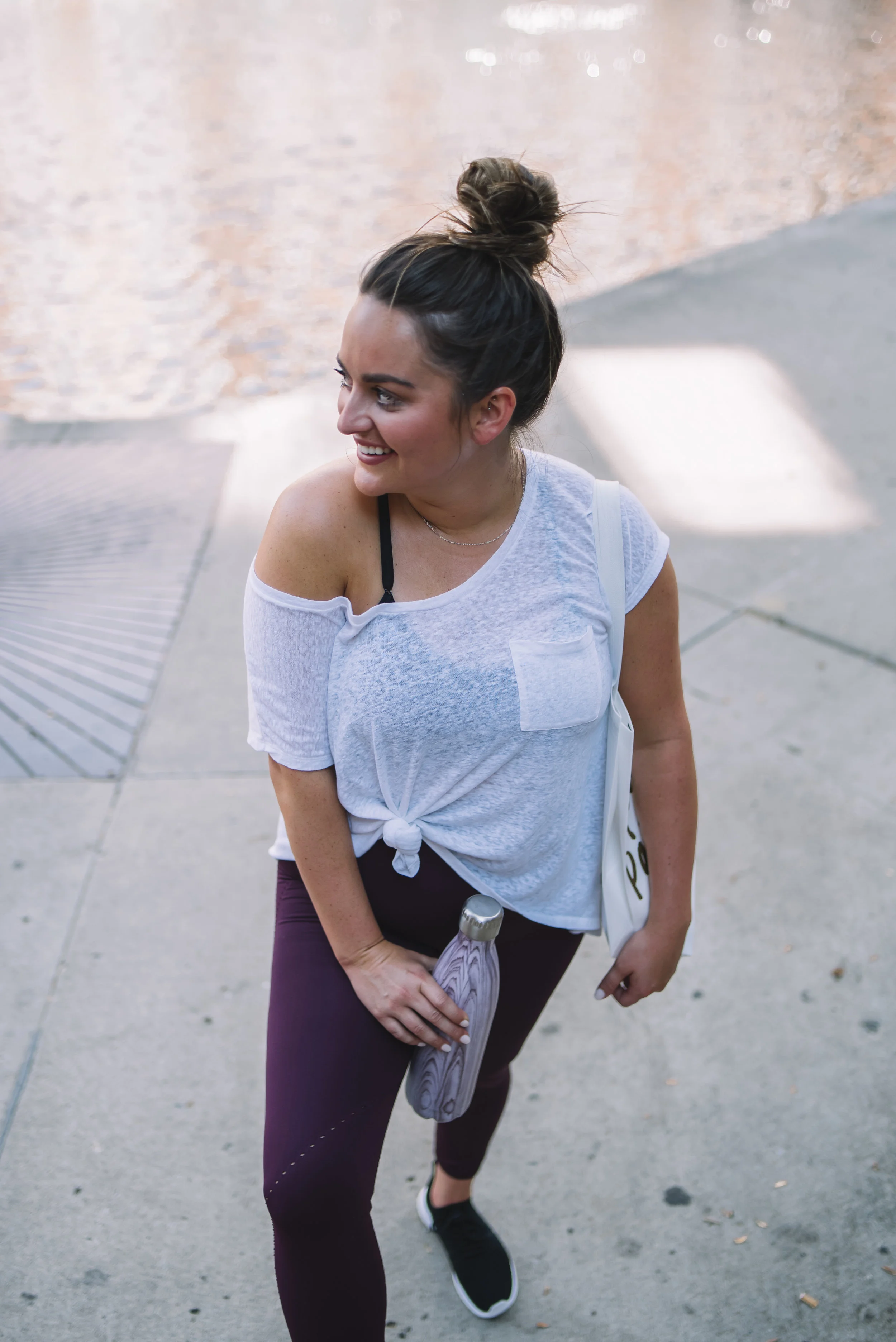 Like I mentioned above, I did a try on haul at the store and had the hardest time picking a final outfit because I loved just about everything! Literally, everything. I ended up with these Seamless High Waisted Capri Leggings in the color Burgundy. Even though they are capri's, they are the PERFECT length on my 5'2 stature! No rolling these babies. These are easily the softest leggings I own and I love the little vented holes that give my legs some air! They also come in a really cool blue color as well if you're not crazy about the purple. :) I'm wearing a small.